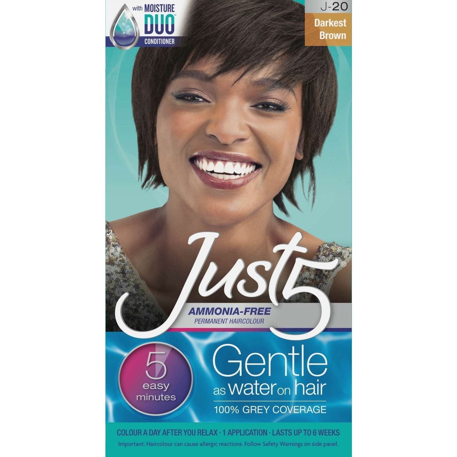 If youre looking for the perfect dark hair dye to cover all your greys we have the perfect product for you. The Just 5 Ammonia-Free Permanent Haircolour in the Shade Darkest Brown will cover 100% greys in just 5 minutes and give you a rich hair color that lasts for 6 weeks.